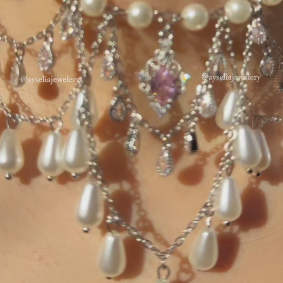 Materials: Rhodium-plated charms, stainless steel findings, glass pearl beads.